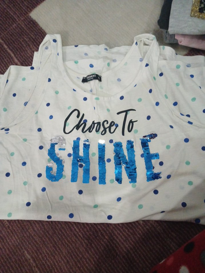 Pamuklu, kısa kollu, düğmeli beyaz tişört, renkli puantiyeler ve parlak payetli "Choose To SHINE" yazısı ile. Rahat kesim ve yuvarlak yaka.
