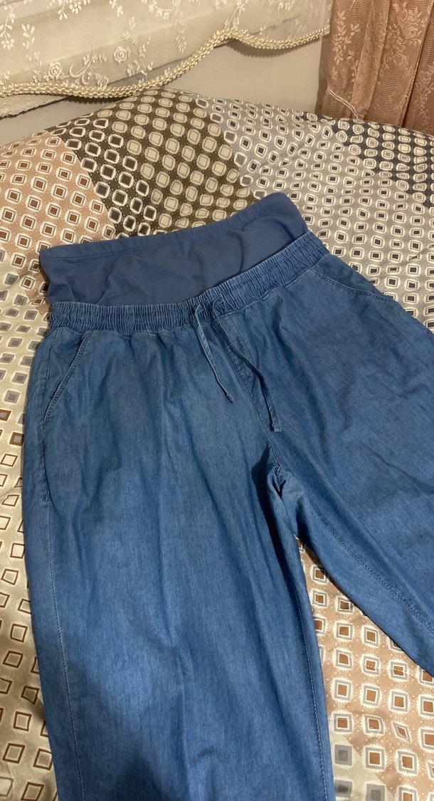 Gri bel bantlı, bol kesim mavi kadın denim pantolon, günlük kullanım için idealdir. Normal midi boyda ve rahat bir tasarıma sahiptir.