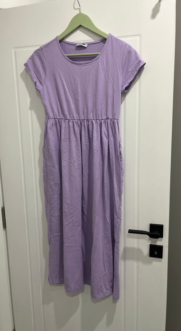 Lila likralı kumaştan, kısa kollu ve yuvarlak yakalı, rahat kesimli uzun elbise. Günlük kullanıma uygun, sade ve şık.