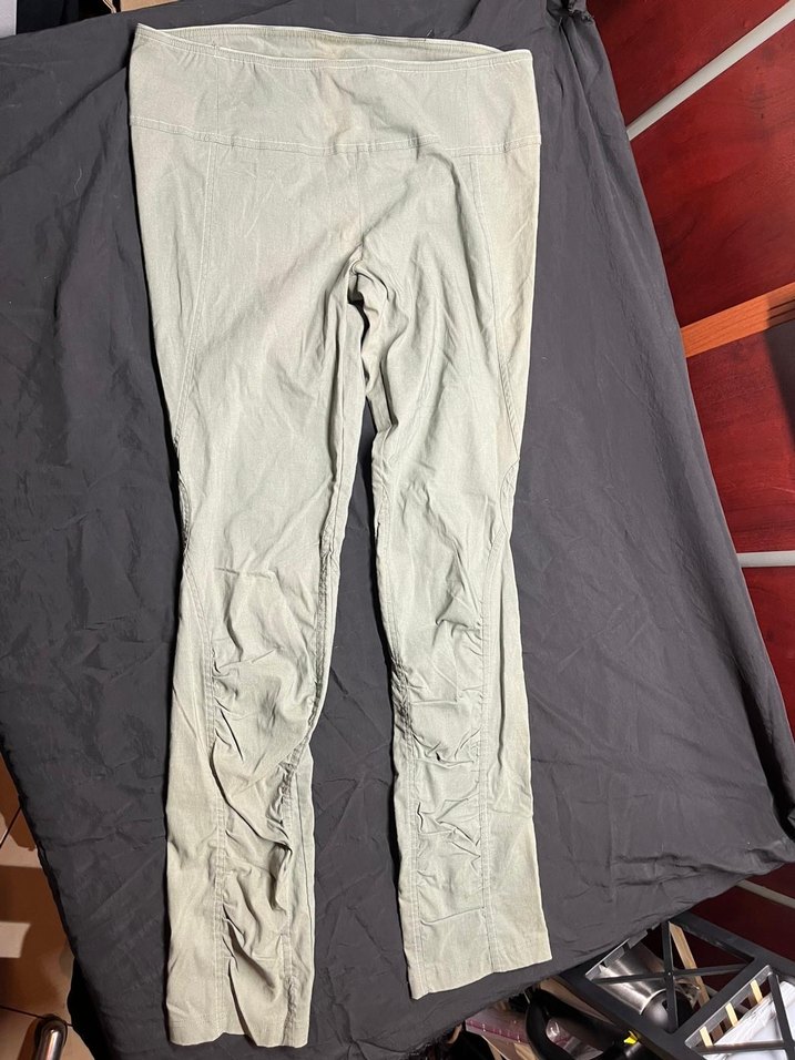 Bej keten kumaştan, pilili detaylı, midi boy, vücuda oturan kadın pantolonu. Günlük sokak stili ve athleisure tarzına uygun.