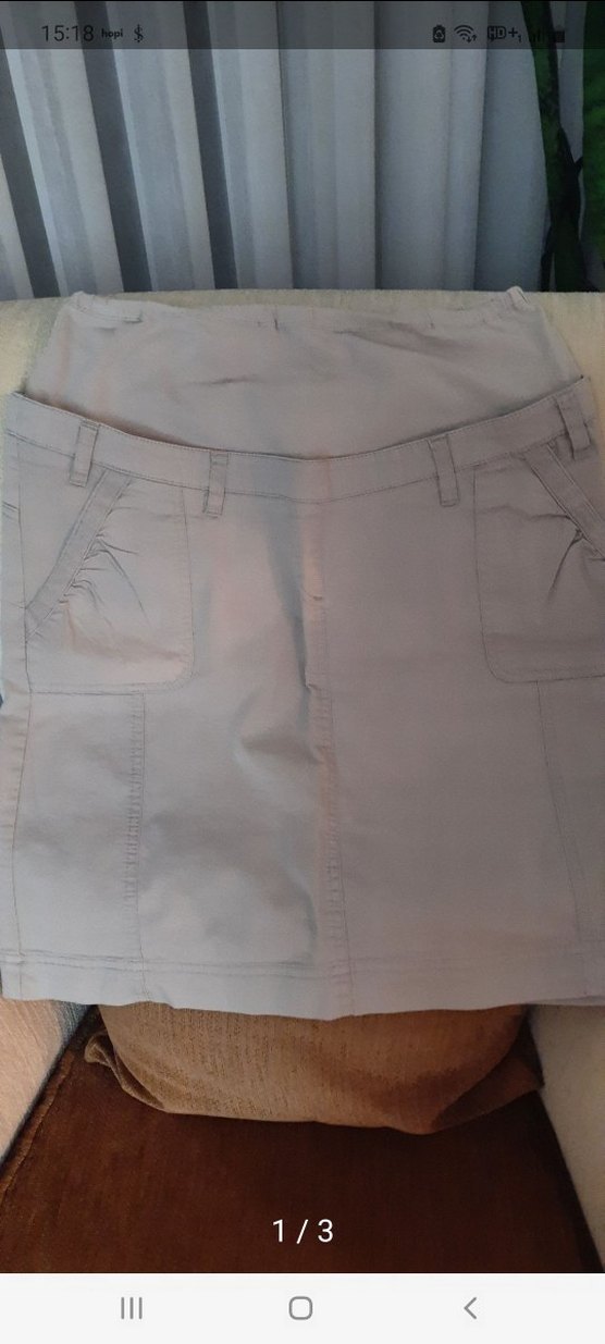 Bej renkli, keten kumaştan yapılmış ve normal kesim hamile eteği. Rahat ve şık, günlük dış mekan kullanımı için uygundur.