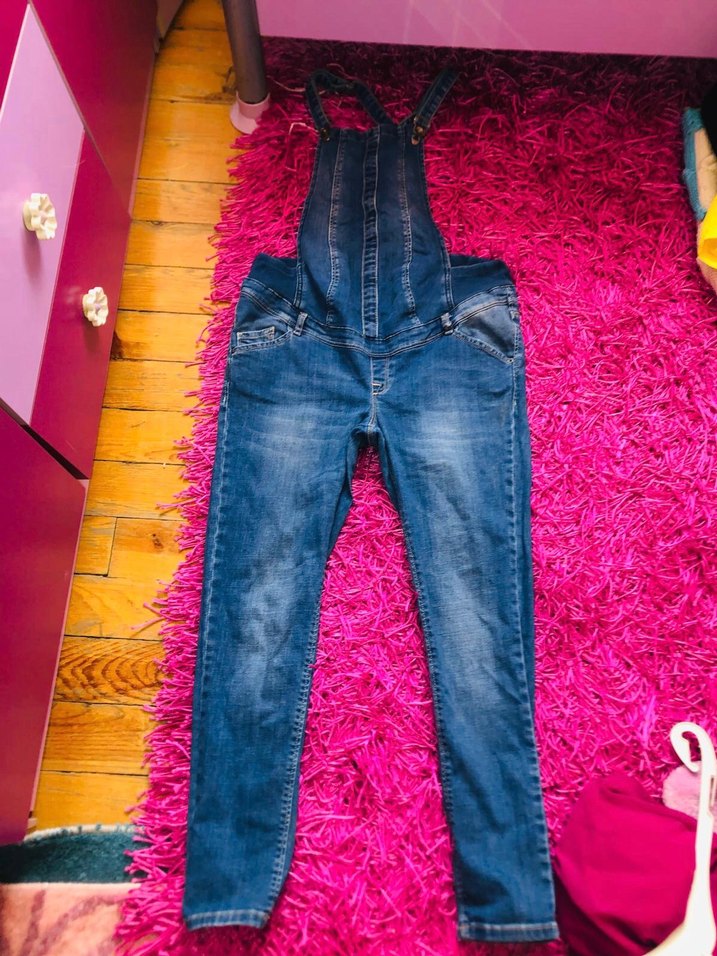 Kızlar için renkli, mavi denimden yapılmış, askılı ve tokalı, tie-dye desenli, street wear tarzında oturan tulum.