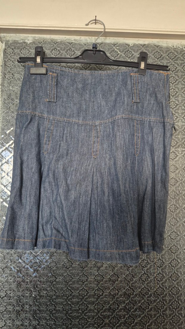 Navy renkli hamile midi kot etek, bol kesim ve pile detaylarıyla günlük rahat kullanım için uygundur.