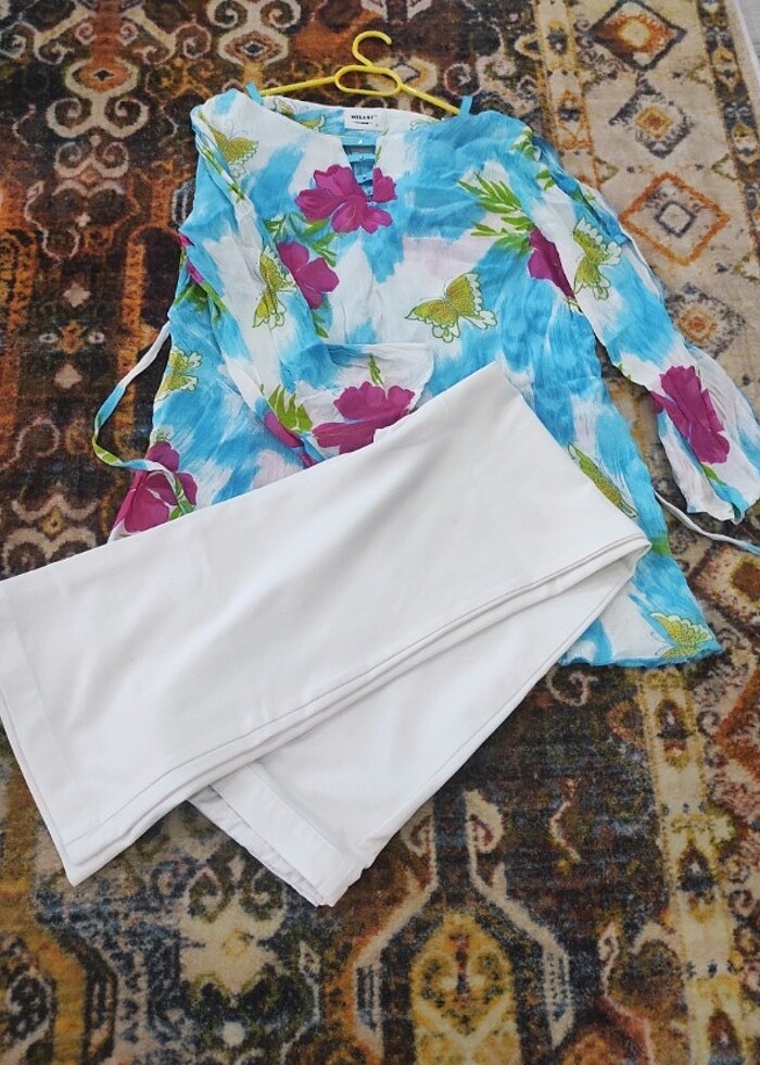 Pantolon yüksel bel kendinden ayarlanabilir düğmesi var. Boy 102 cm, Bluz çok şık kol detayları ile özel bir gecede giyilebilinir.