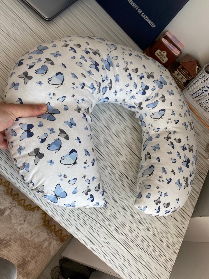 Pastel mavi renkli, kelebek desenli baskılı hamile ve emzirme yastığı rahat destek sağlar.