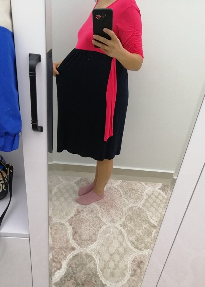 Tertemiz. Çok sevdiğim elbisemi hamile iken 1 kaç kez giymiştim. Tercihen hamile değilken de kullanılablir. Tam mevsimi. Çok rahat. Boyum 168.dize geliyor. Üst kısmı nar çiçeği altı lacivert. Arka bağcığı karın durumuna göre ister önsen ister arkadan bağlanablir. Markası Hell Klardır. Markamın ürünlerini araştırabilirsiniz. Kaliteli ve pahalıdır. Ütü dahi istemez. Yıka giy.