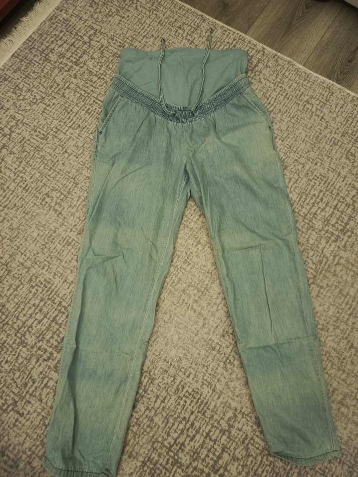 Bebek bekleyenler için kemerli, bol kesim denim pantolon. Normal boy, rahat ve günlük kullanıma uygun, bel detaylı.