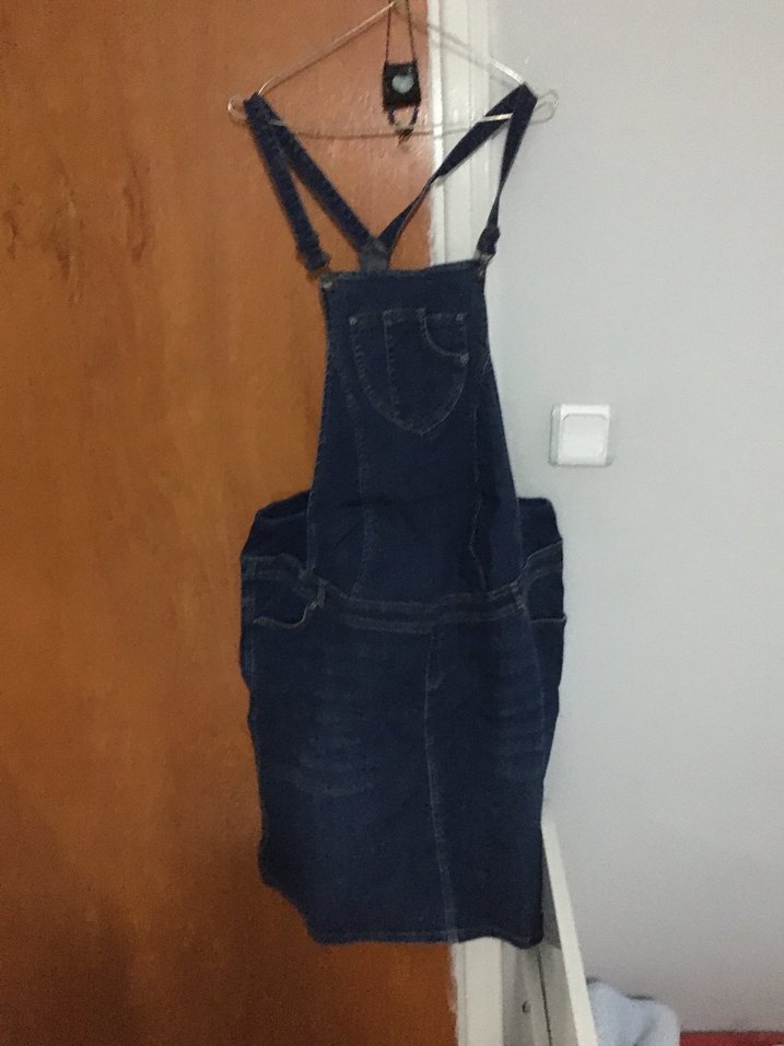 Ayarlanabilir tokalı askılar ve oturan midi boy tasarımlı lacivert denim kısa kadın salopet. Günlük rahat sokak stili için uygundur.