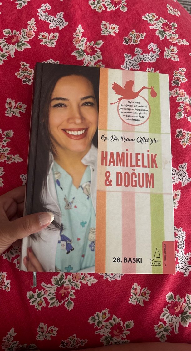 Op. Dr. Banu Çiftçi'nin 28. baskı Hamilelik & Doğum kitabı, gebelikten doğuma kadar detaylı bilgiler içerir. Yan tarafına çay lekesi gelmiştir ama asla sayfa içeriğinde yoktur