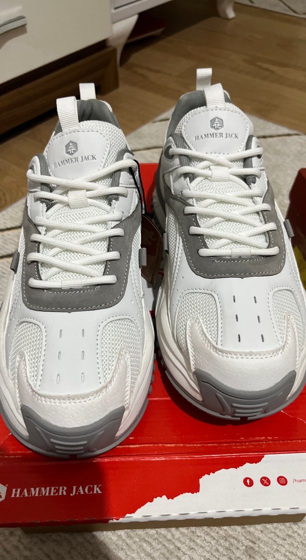 Hammer Jack markalı, bağcıklı, gri beyaz renklerde, baskılı detaylı, kauçuk tabanlı spor ve günlük kullanıma uygun ayakkabı.