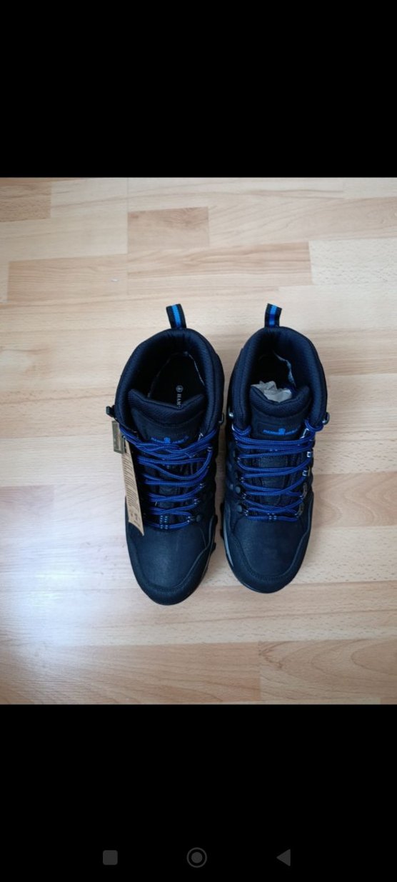 Koyu mavi renkte, kauçuk malzemeden yapılmış, cırt cırtlı, dış mekan için uygun erkek spor botları.