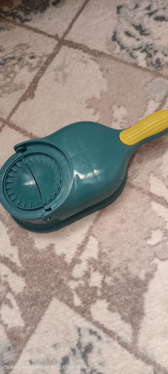 Sarı saplı, turkuaz renkli plastik mutfak aracı, kolay kullanım ve dayanıklılık sunar. Pastel tonu mutfak işlerine yumuşaklık katar.