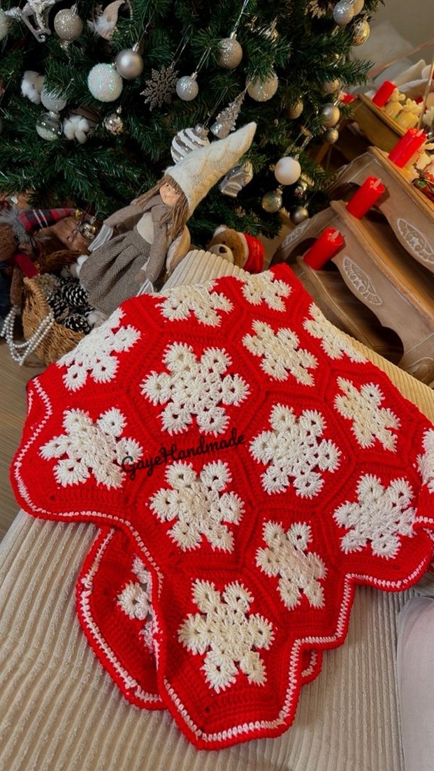 Beyaz kar tanesi desenlerine sahip kırmızı örgü tv battaniyesi, sıcak ve renkli bir görünüm sunar. ❄️