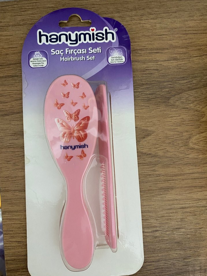 Hanymish saç fırçası seti, kelebek desenli pembe fırça ve uyumlu taraktan oluşur.