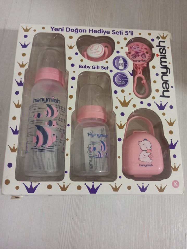 Yeni doğanlar için pembe pastel tonlarda iki biberon, emzik, klips ve tutucudan oluşan bebek hediye seti sıfır kutulu hiç kullanılmadı tertemiz ihtiyaç fazlalığından dolayı satılıktır makul tekliflere acigim