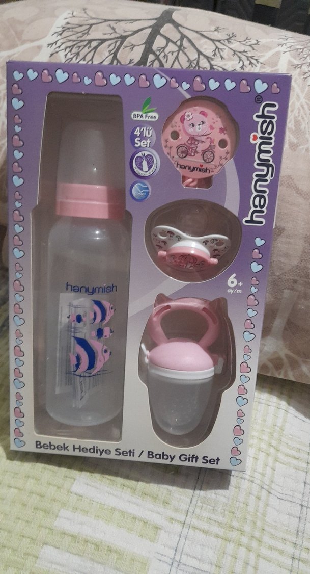 Hanynish pembe bebek hediye seti, 6 ay ve üzeri için biberon, emzik ve besleyici içerir. BPA içermez.