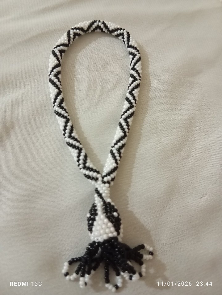 Minimalist bohem tarzda, beyaz ve siyah boncuklardan oluşan, zikzak desenli erkek tesbih, püsküllü son detayla tamamlanmıştır. ️