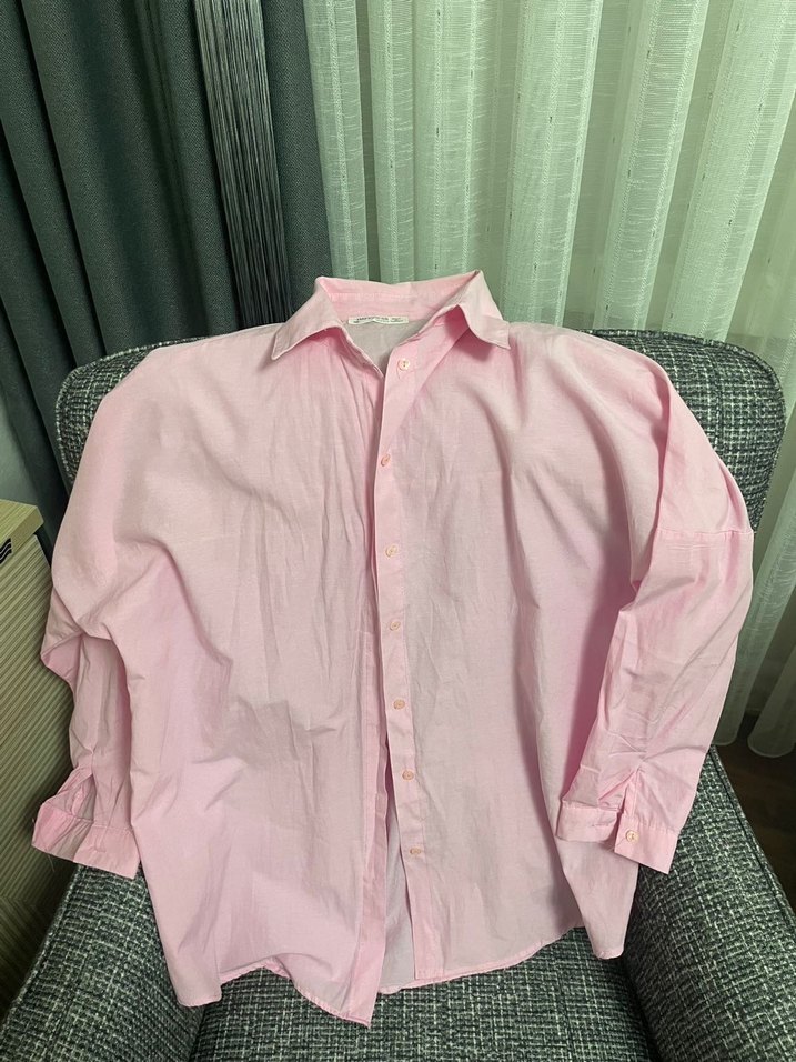 Çok tatlı bir rengi var. 3-4 kez giydim, önünde çok belirsiz bi leke var son görsele ekledim bakabilirsiniz. Gömleğin yeşil rengi de profilimde mevcut. İkili almak isterseniz ilan açabilirim.