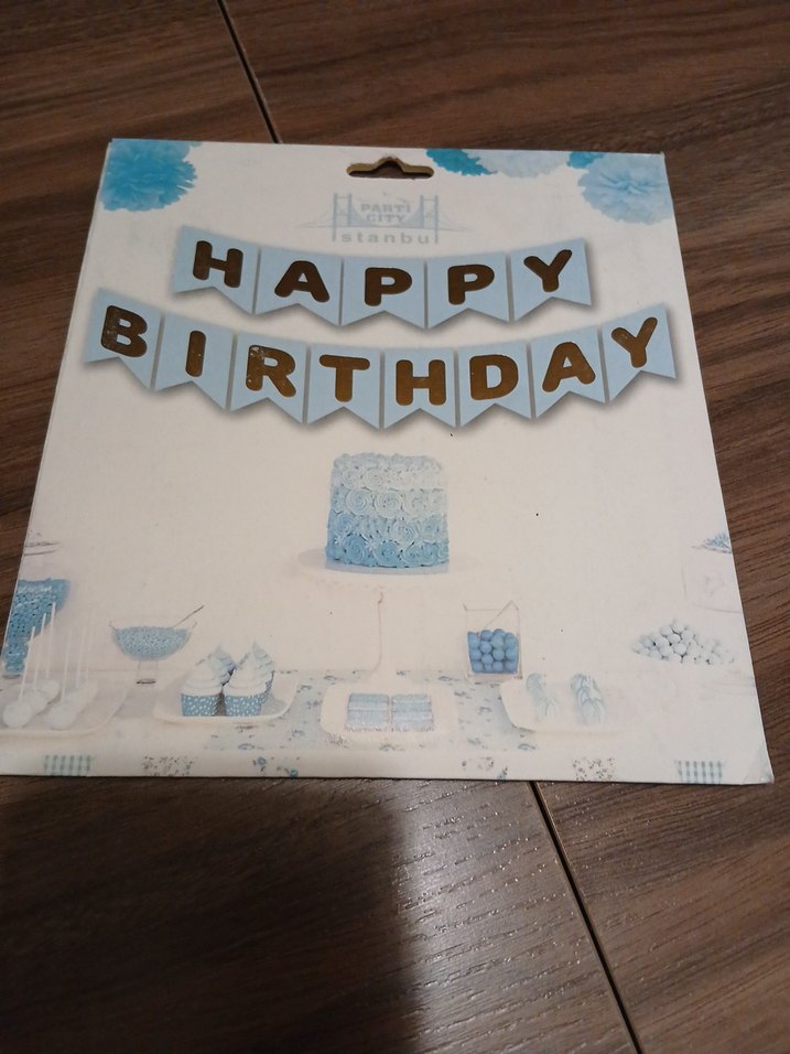 Mavi pastel tonlarda, bayrak şeklinde parçalar üzerine yazılı Happy Birthday yazısı içeren parti süsü.