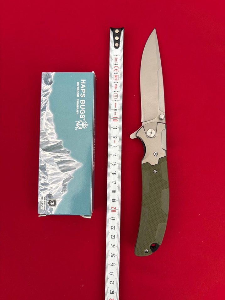 HAPSBUGSM katlanır bıçak, dayanıklı malzemeden yapılmış haki sapı ve keskin bıçağı ile güvenilir kullanım sağlar.