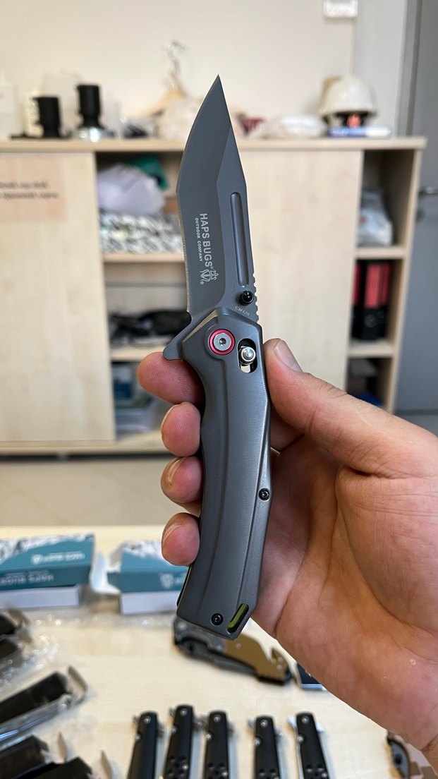 HAPSBUGS markalı, keskin bıçağa sahip gri katlanır bıçak. Şık sap tasarımı ve güvenli kilit mekanizması bulunur. Titanyum kaplama sırt destekli yandan yaylı kilitli kemer klipsli tanto kesim çok güzel bir çakı