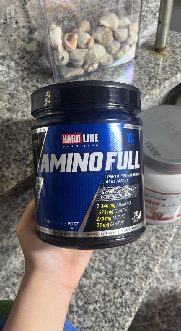 Hard Line Amino Full, 2.340mg amino asit, 525mg kreatin, 270mg taurin ve 25mg kafein içeren parlak mavi toz spor takviyesidir.