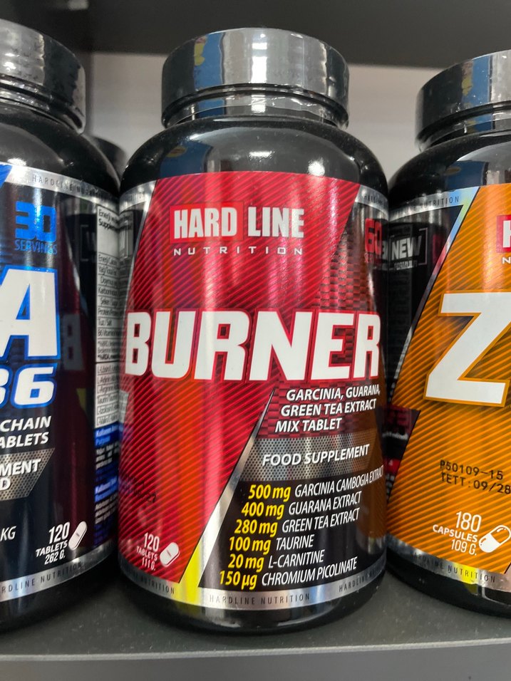 Hard Line Burner, garcinia, guarana, yeşil çay ekstraktı, taurin ve L-karnitin içeren renkli kırmızı bir gıda takviyesidir. 120 karışık tablet içerir.