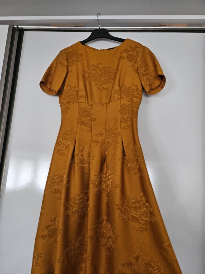 Hardal rengi diz altı elbise, kısa kollu ve bisiklet yakalıdır. brokar kumaştan, pileli ve düzenli kesimlidir. Modern klasik stilde, cok kibar bir elbise. adil ışık marka small beden