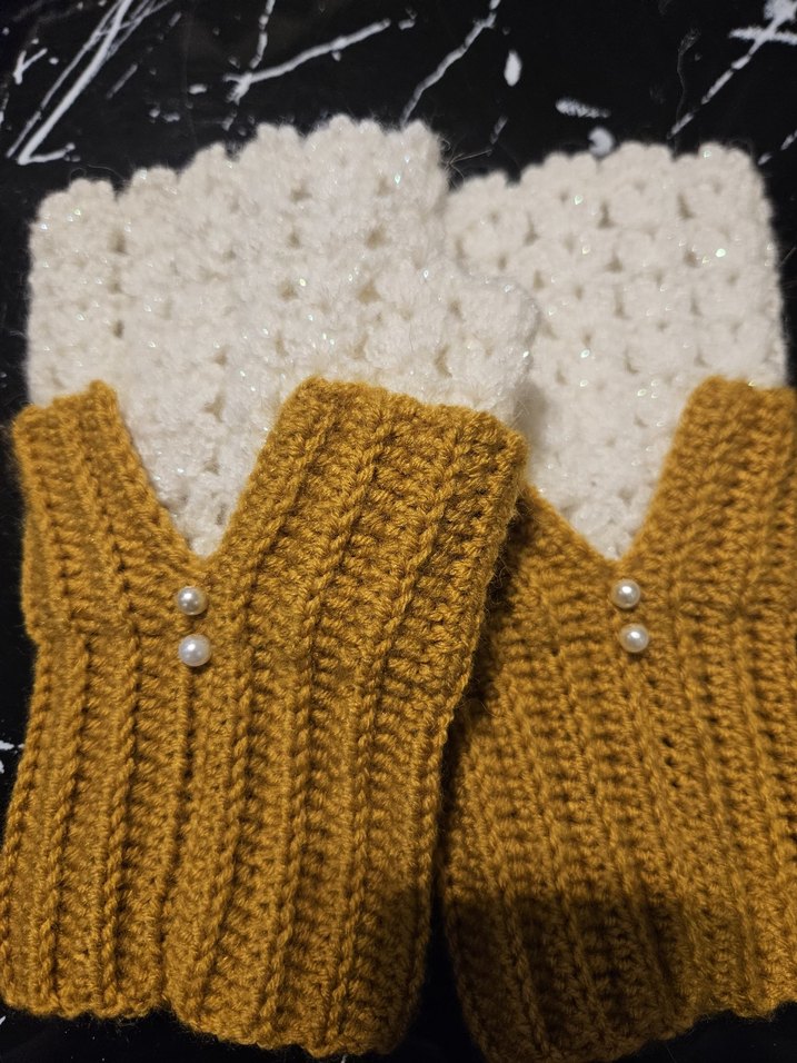 Hardal ve beyaz renklerde, inci detaylı bohem tarzda örgü kadın eldiveni. Yumuşak ve sıcak örgü kumaştan yapılmıştır. El işi örgüdür.