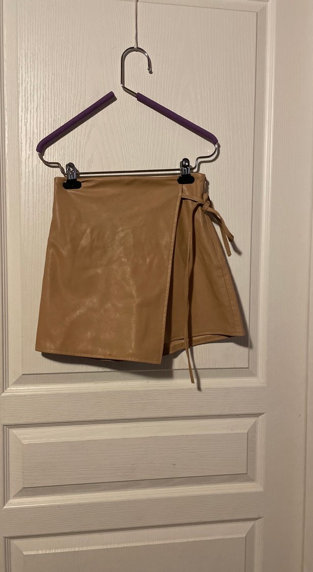 Bej renkli deri mini şort etek, kuşaklı ve bol kesimdir. Paris tarzı günlük sokak giyimi için uygundur, desen içermez ve kısa boydadır. Bir kez giyilmiştir.