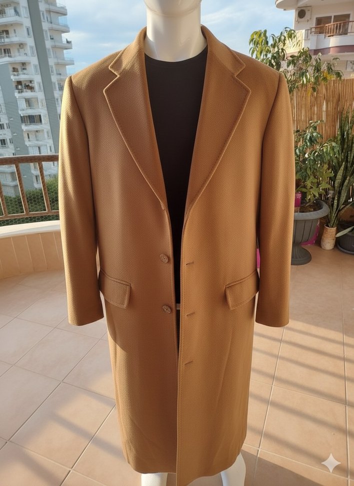 hardal renkte, cashmire kumaştan uzun klasik kaban. Düğmeli, çıtalı yakalı, uzun kollu ve rahat kesimdir. Ofis için uygun şık bir modeldir.