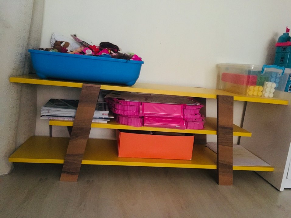 Sarı ve kahverengi tonlarda çok raflı, çeşitli eşyalar için uygun renkli dolap düzenleyici. ️