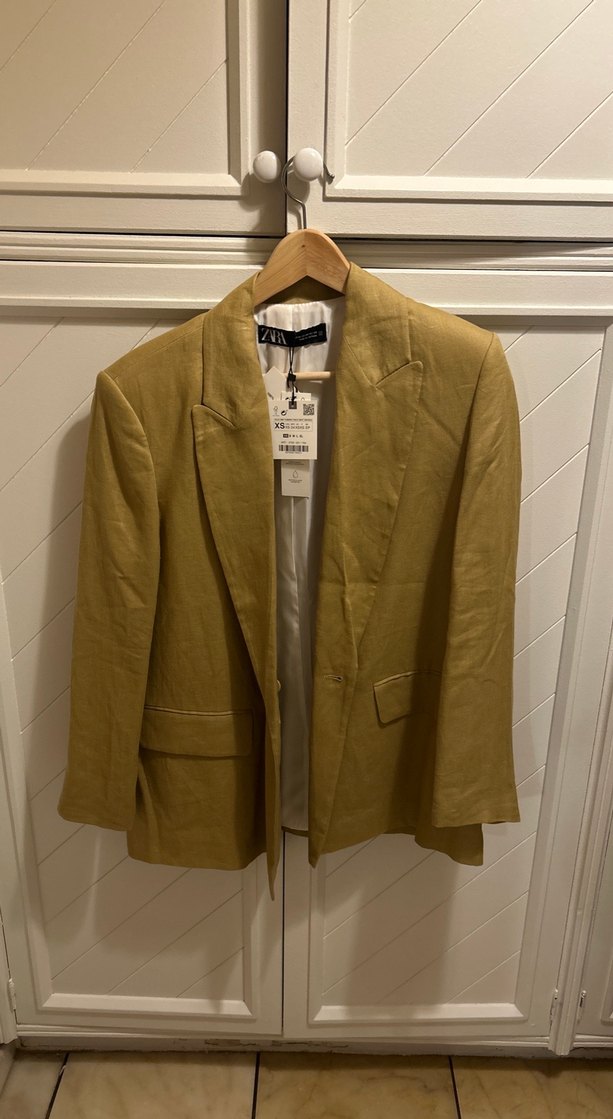 Hardal keten kumaştan, yakası kırmalı ve düğmeli, uzun kollu midi uzunlukta kadın blazer. Ofis için uygun, parlak sokak tarzı detaylı. ✨