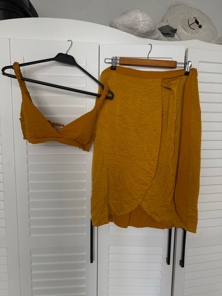 Hardal renkte, ince askılı dokulu büstiyer ve sarma tarzı etek, yumuşak kumaştan üretilmiştir.