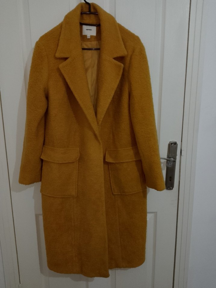 Hardal renginde, yumuşak ve sıcak dokulu uzun kaban. Geniş yakalı ve cepli, soğuk günler için ideal bir parça.
