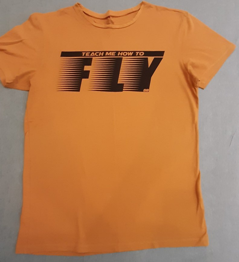 Hardal renkli, kısa kollu, bol kesim erkek tişörtü. Önünde renkli 'Teach Me How To Fly' baskısı vardır, sentetik yumuşak kumaştan üretilmiştir. ✈️Temiz kullanıldı. Bir kusuru yok.