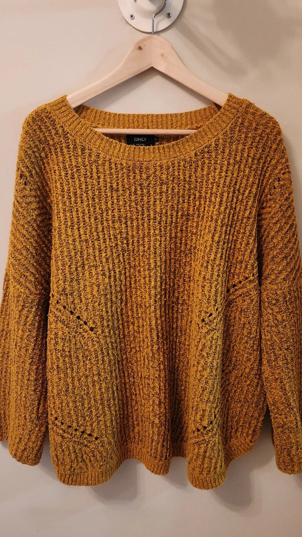 Hardal renkli, örgü kadın kazak, yuvarlak yakalı ve uzun kollu, bol kesimli, rahat bohem tarzında, günlük kullanım için uygundur. ✨ Beden: XL Materyal: %70 Akrilik, %30 Polyester