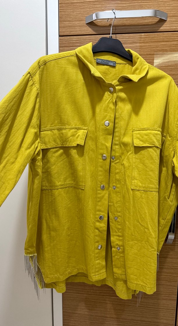 Hardal Sarı Düğmeli Uzun Kollu Keten Gömlek