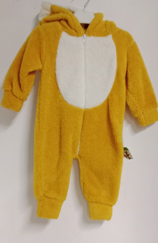 Sarı renkli, yumuşak ve sıcak peluş kumaştan yapılmış, kürk detaylı ve önden fermuarlı bebek tulumu.