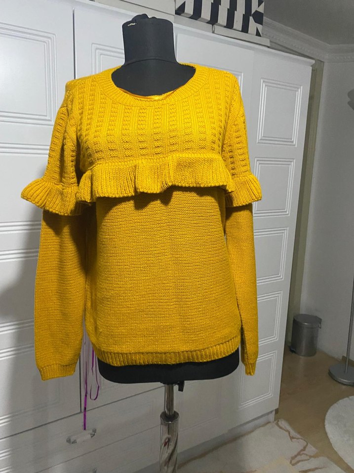Uzun kollu, yuvarlak yakalı, bol kesim sarı örgü kazak, bohem tarzda fırfırlı detaylarla günlük kullanıma uygun.