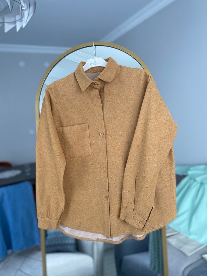 uzun kollu, düğmeli ve yün kumaştan yapılmış kadın gömleği. Normal boyda ve rahat kesimlidir, günlük sokak tarzına uygundur. Bir kaç defa kullanıldı. Hiçbir problemi yoktur.