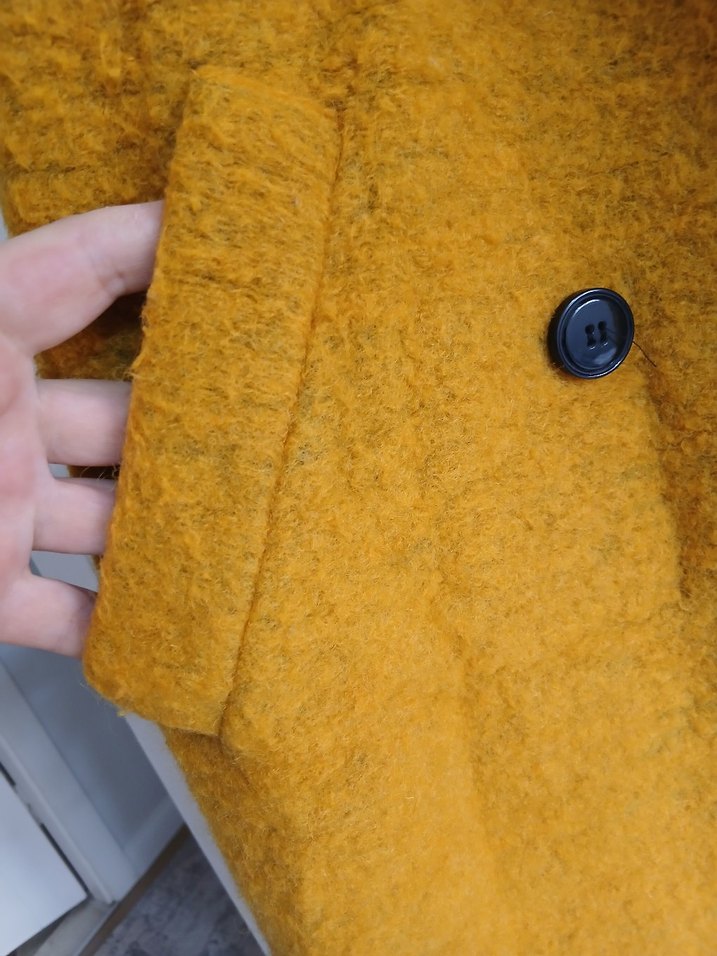 Hardal sarısı, yumuşak dokulu kumaştan yapılmış çift düğmeli kadın kabanı. Yan cepleri ve sıcak astarı vardır.
