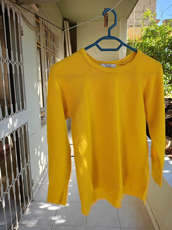 Hardal sarısi renkli, yuvarlak yaka, uzun kollu, triko dokulu ve bol kesim bir kadın kazağıdır. Normal boyu ve sade tasarımıyla günlük rahat kullanıma uygundur.