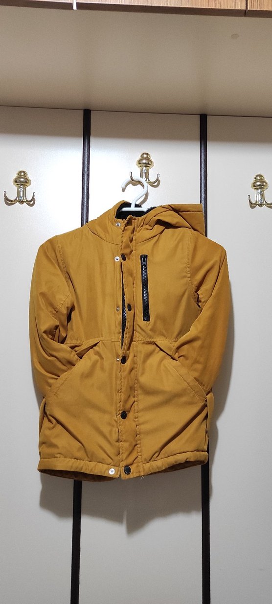 hardal sarısı kapüşonlu, orta kalınlıkta ve yumuşak dokulu erkek çocuk kabanı, düğme ve fermuar ile kapanır, ceplidir.
