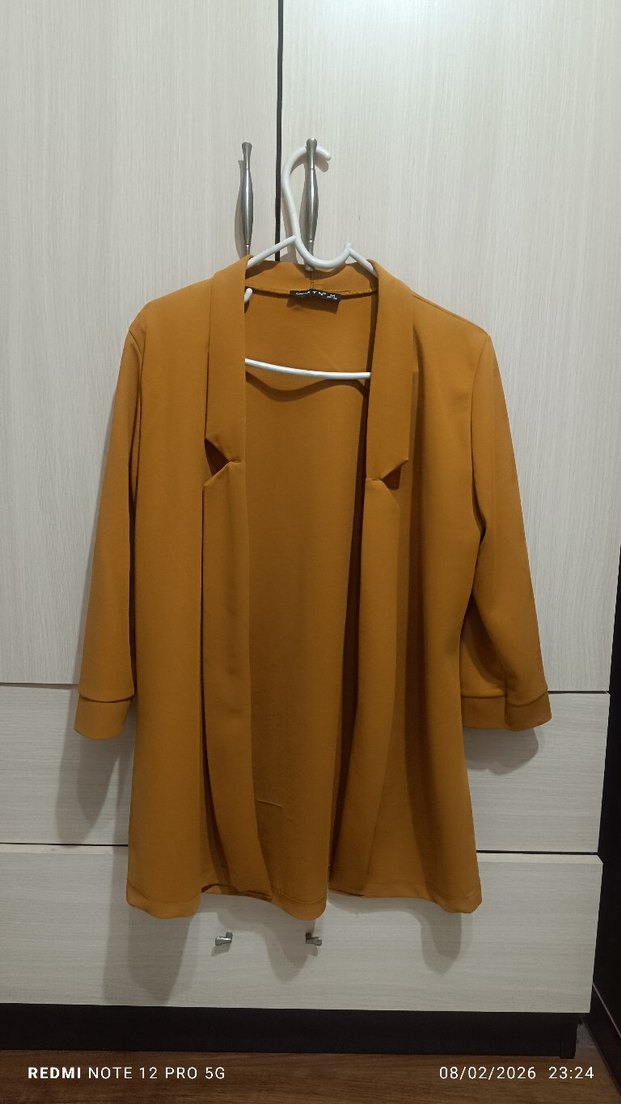 hardal sarısı renkli,normal boyda, kadın ceket. İpeksi parlak kumaştan, normal kesim ve uzun kollu, hem ofis hem günlük kullanıma uygun. ✨