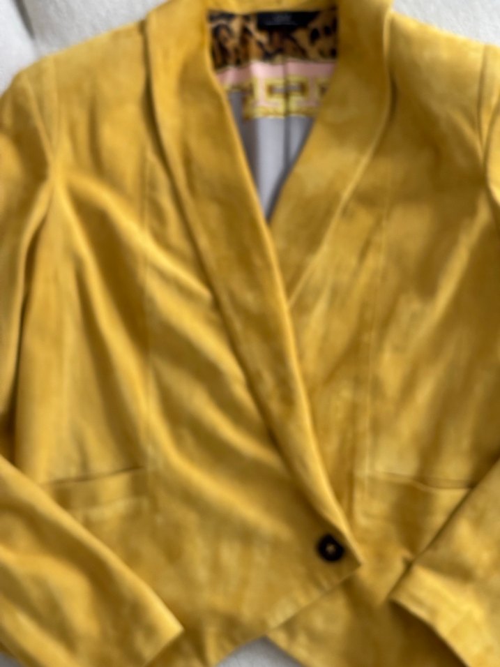 Sarı süet kumaştan, yakalı ve düğmeli kadın blazer ceket. Uzun kollu, normal kesim ve midi boyda, ofis için uygun. ✨