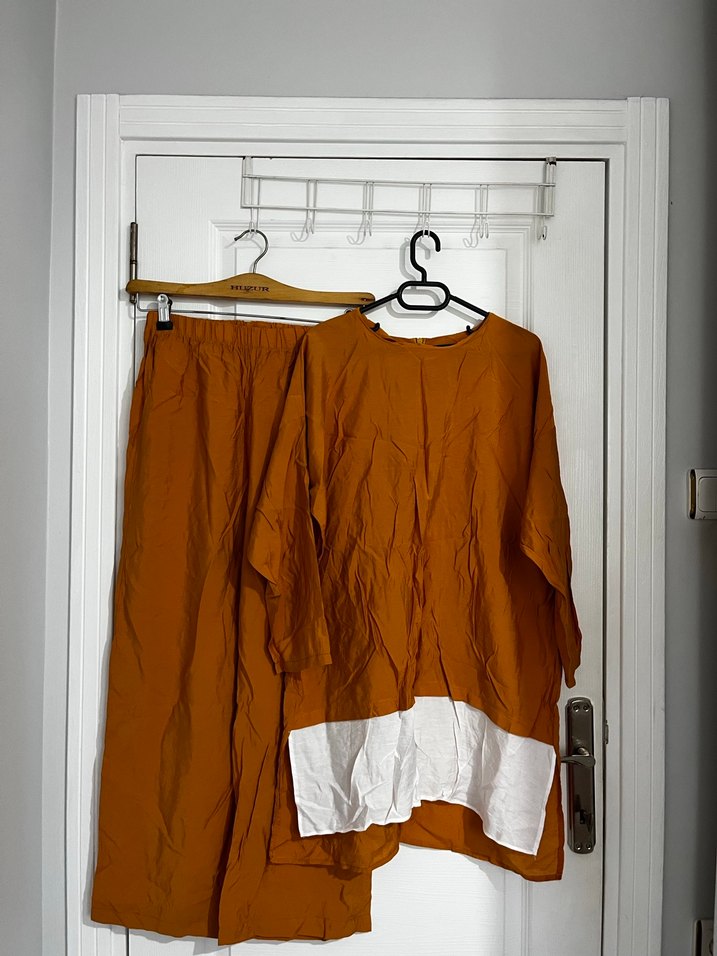 Hardal sarısı salaş kesim üst ve pantolondan oluşan takım, üst kısmında beyaz detay bulunur. Hiç giyilmedi aldığı gibi kullanılmadan kaldırıldı ütülenerek gönderilecektir