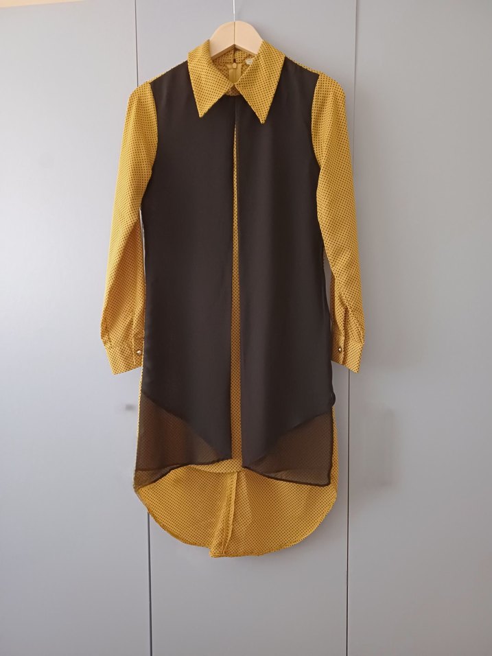 Kadınlar için yakalı, uzun kollu, çoğunluğu viskon olup polyester karısımlı,altı oval kesim, ön kısa arkası uzun , bele kadar uzanan fermuar detaylı , puantiyeli koyu renk detaylı midi boy tunik. Ofis ve günlük kullanım için modern ve şık bir seçim.