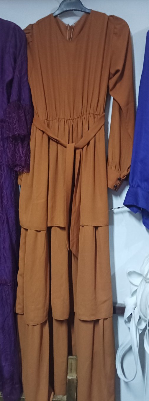 hardal sarısı, bol kesim, drapeli uzun elbise. Yumuşak sentetik kumaştan, bohem tarzı ve yüksek yakalı, günlük kullanım için uygundur. tesettür giyimde defosuzdur kullanılmadı sıfır ürün