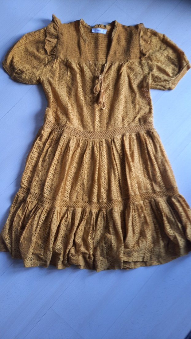 Hardal renkli, sentetik kumaştan yapılmış, kısa kollu ve V yakalı bu midi elbise bol kesimdir. Volan detayları ve parlak dokusuyla günlük kullanıma uygundur.